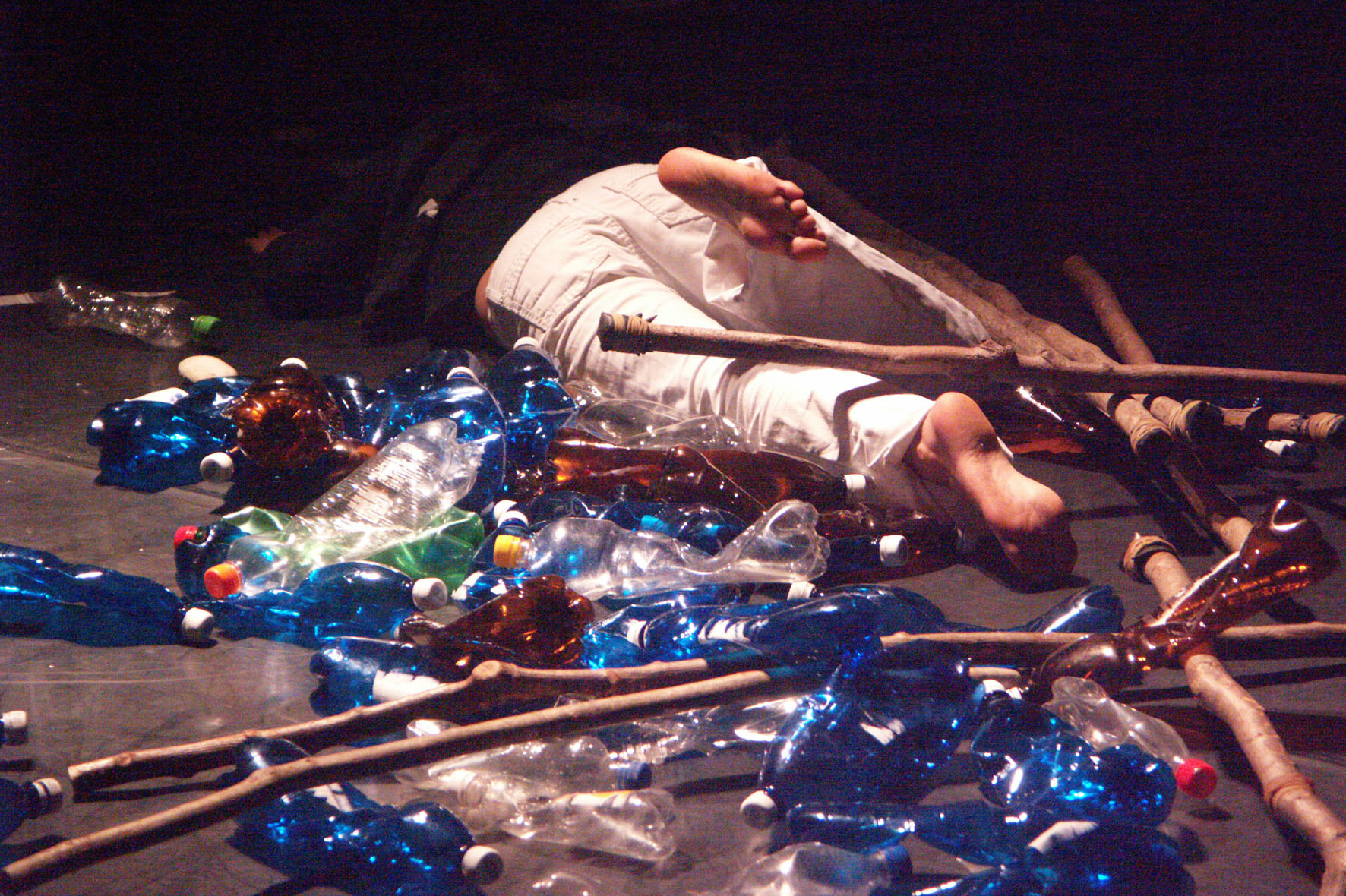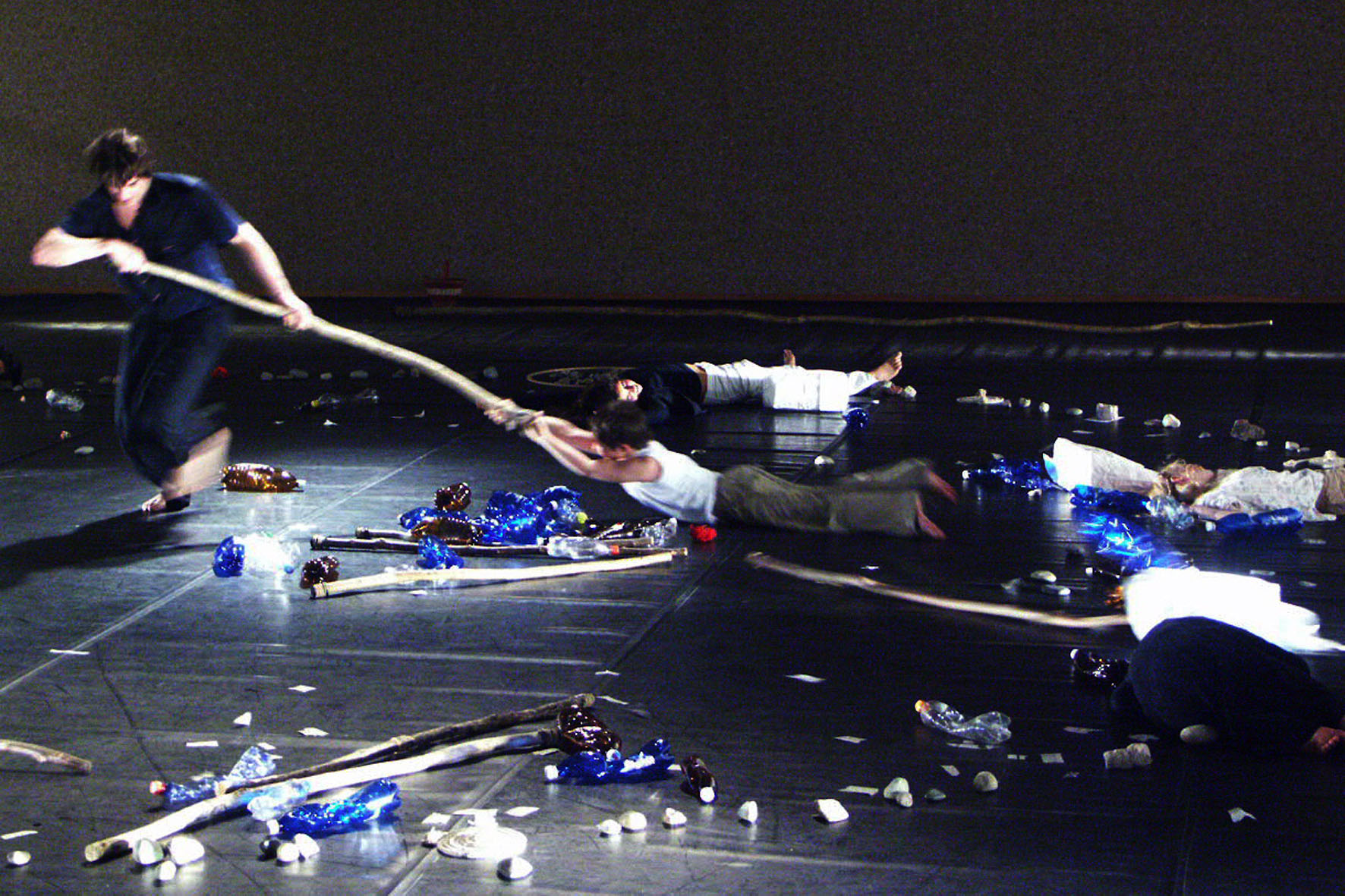 „(...) « Wann ist Zeit », ein choreographisches Objekttheater der schweiz-französischen Gruppe éclat. 7 Kinder und 2 Erwachsene malen mit Hilfe von Naturmaterialien Bilder. Mit Steinen und Holzstecken etwa eine Uhr, das Bild unserer Gesellschaft, unserer Zeit, eine Zeit der Unruhe der Bedrohung, der Zerstörung. Ein unaufhörliches Ticken, es wird immer schneller immer lauter, Zeit die uns fehlt. Tragtaschen von Grossfilialen voll mit Pet-Flaschen smbolisieren den unaufhaltsamen Konsum. Chaos total ! Und denoch, es gibt Hoffnung. Da gibt es nebst allem zerstörerischen noch schöne und poetische Momente. Das Stück endet in der Versöhnung- am Schluss pflanzt ein Mädchen eine Blume in den strapazierten Boden. Auf Text wird fast gänzlich verzichtet. Mit dem Tanz, mit Bewegung und dem Spiel mit den Objekten entstehen Bilder. Alles was auf der Bühne ist wird beseelt, wird zur Figur: Holzstange, Stein aber auch Schauspieler. (...)“